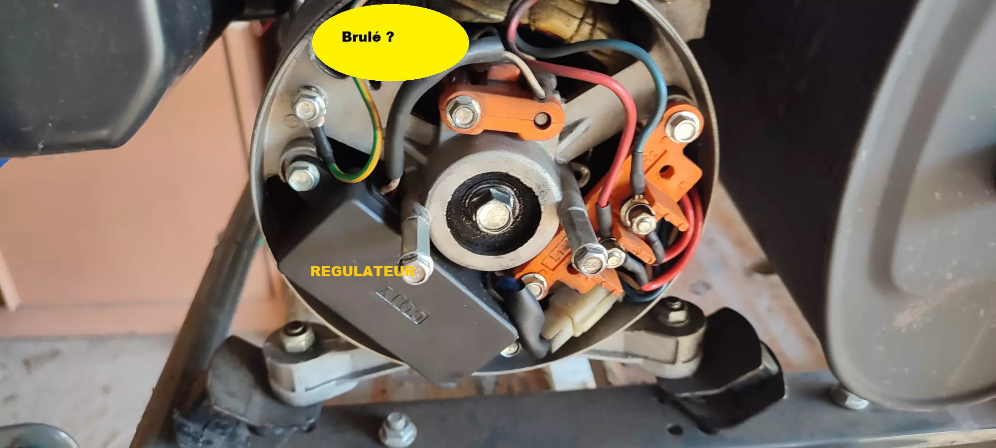 Bonjour, plusieurs pistes.. vérifier l'état des charbons, le régulateur à t'il été changé, ( rectangle noir) ? Regarder avec soin le bobinage sous le fil de terre, il me semble noirci