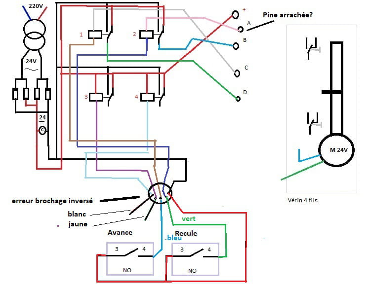 En fait qu'en on met en contact les fils bleu et rouge le verrin avance on entend le relais, donc le fil blanc couplé avec le rouge devrait faire rentrer le verrin, on entend le relais mais rien, cette piece à cet emplacement y est pour beaucoup dans le fonctionnement des relais pour la descente, je vais donc y mettre une résistance pour ponté les relais qu'en pensez vous? en espérant que cela marche. J'attend vos réponses. Merci.