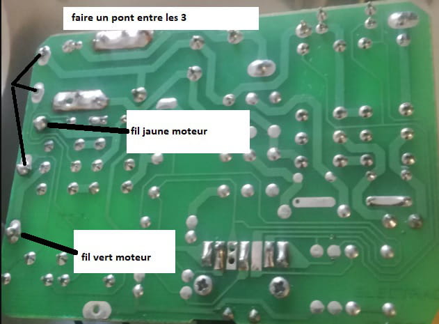 si vous voulez tester, sur la carte branchez uniquement le fil vert et le fil jaune (débranchez les deux autres) et faire un pont sur les 3 points