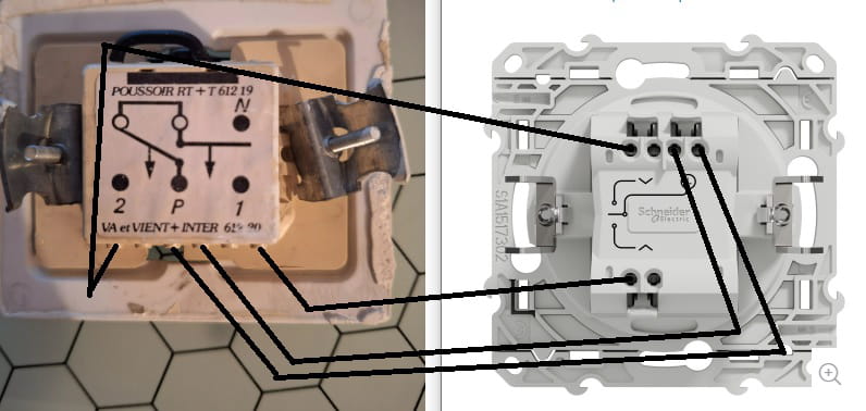 Je souhaite remplacer un vieux interrupteur de volet roulant (origine de la maison de 1997) par un interrupteur Schneider (gamme Odace). J'ai remplacé les 3 premiers sans problème mais en démontant le 4ème surprise : je me retrouve avec 4 fils bleus et 4 fils marrons.