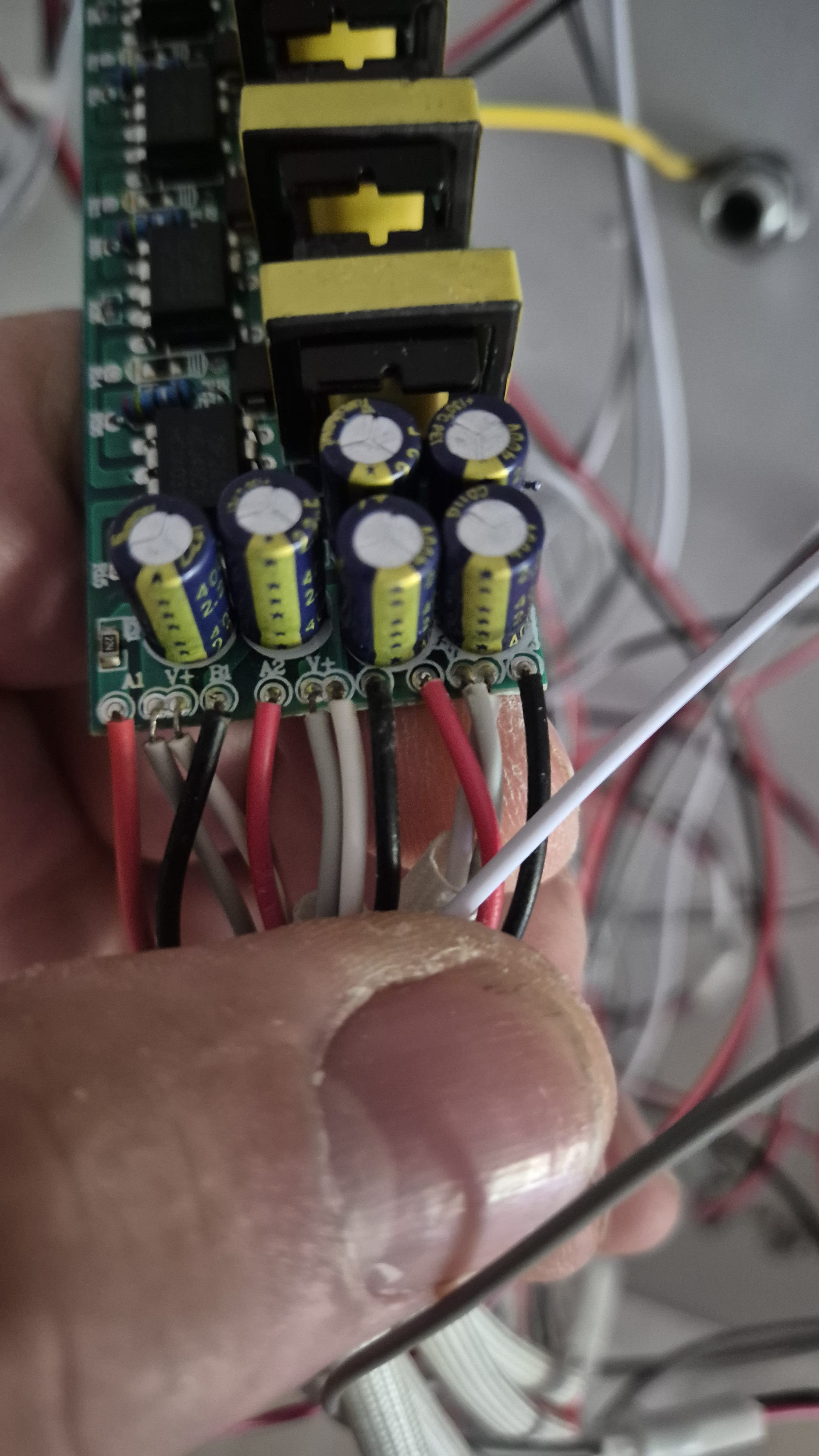 Je pense que la puissance arrive par le plot V1 et que les 2 circuits LED des 4 lampes sont connectés au A1 et B1.