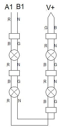 Depuis chaque lampe, il arrive un couple fil R (rouge) et N (noir) et revient un couple fil B (blanc) et G (gris).