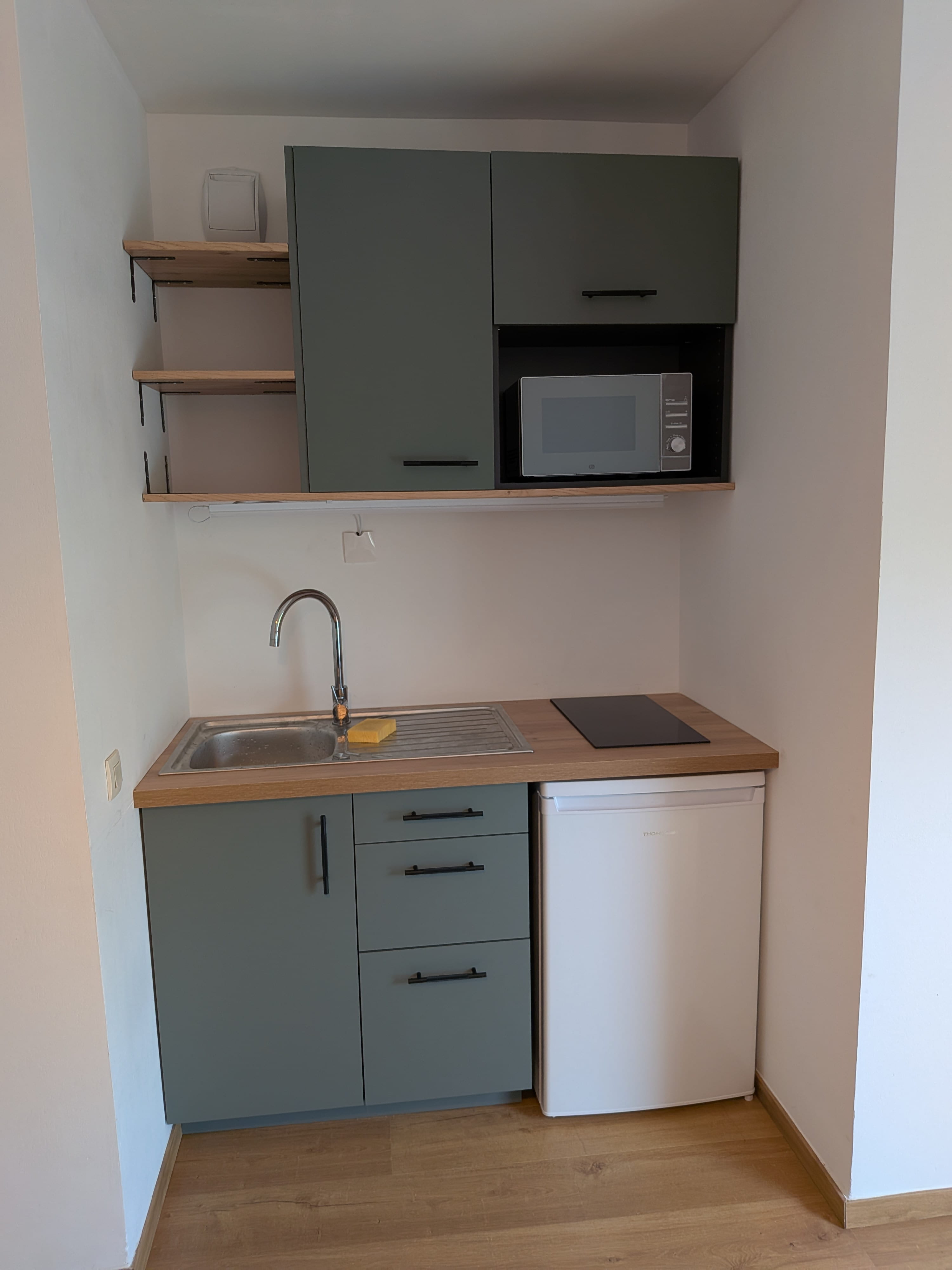 J'ai installé dans une kitchenette un frigo top juste en dessous d'une plaque à induction, voir photo. Pas vraiment d'autre configuration possible vu la taille de l'espace et l'emplacement de la plomberie.