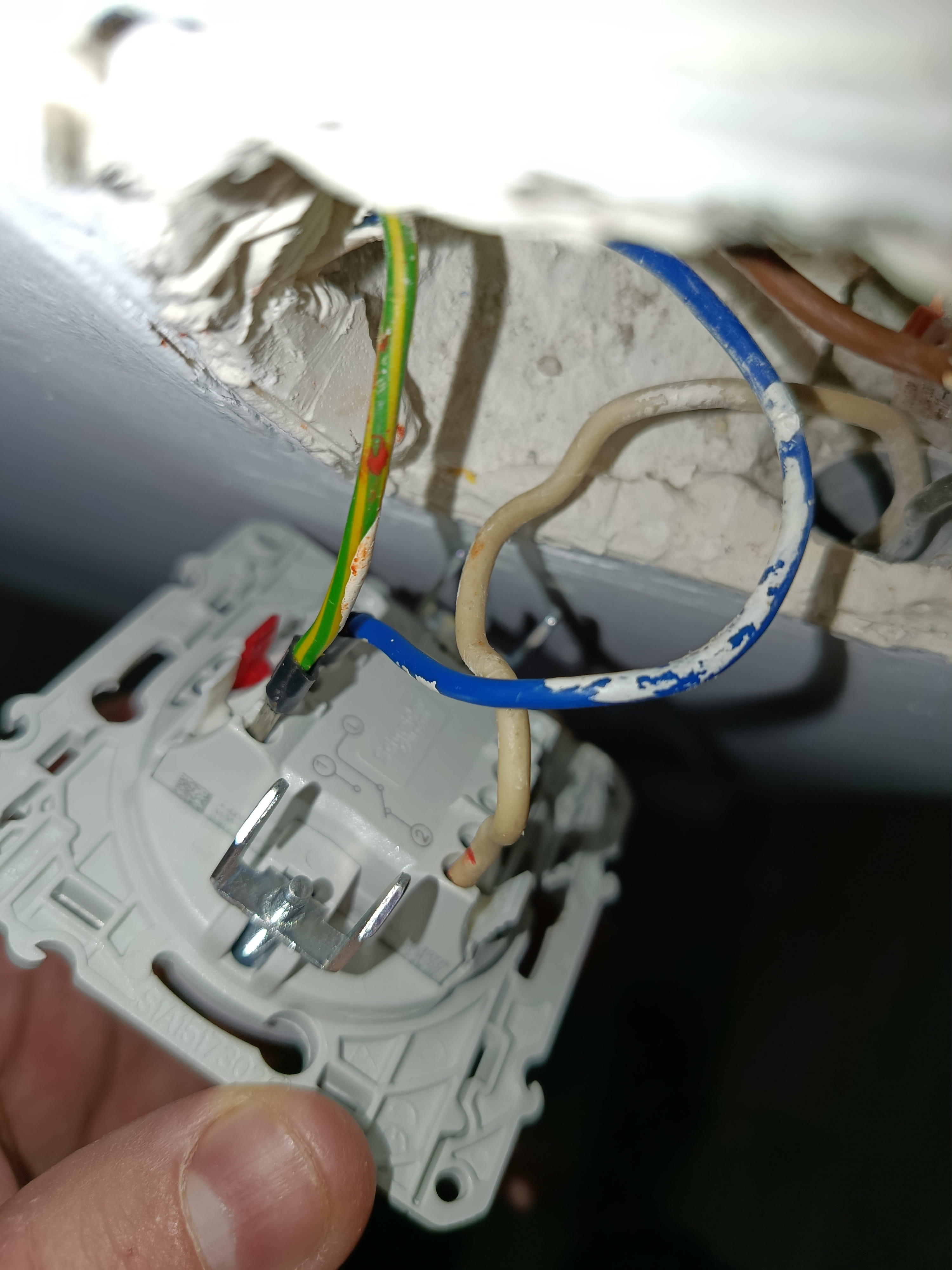 En regardant un schéma, j'ai compris qu'il fallait trois fils, il y en a bien trois, mais dedans il y a la terre. Un fil bleu, un beige et l'autre côté bleu et marron et la terre.