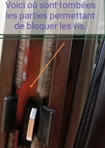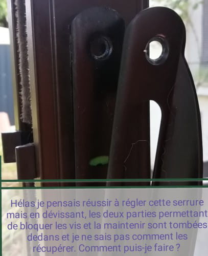 Celle qui n'a pas de poignée extérieure, des parties permettant de bloquer les vis fixant la serrure sont tombées dans le bâti et je n'ai pas réussi à les récupérer.