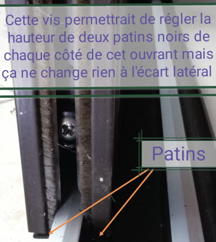 Celle qui a une poignée extérieure, j'ai réussi à la régler (mais le problème de réglage du pan demeure). Toutefois, en mettant une cale sur l'un des montants, le pan se redresse et ce côté de la baie est complètement fermé (l'air ne passe plus, plus d'écart) et verrouillé. On ne peut pas l'ouvrir et le fermer normalement.