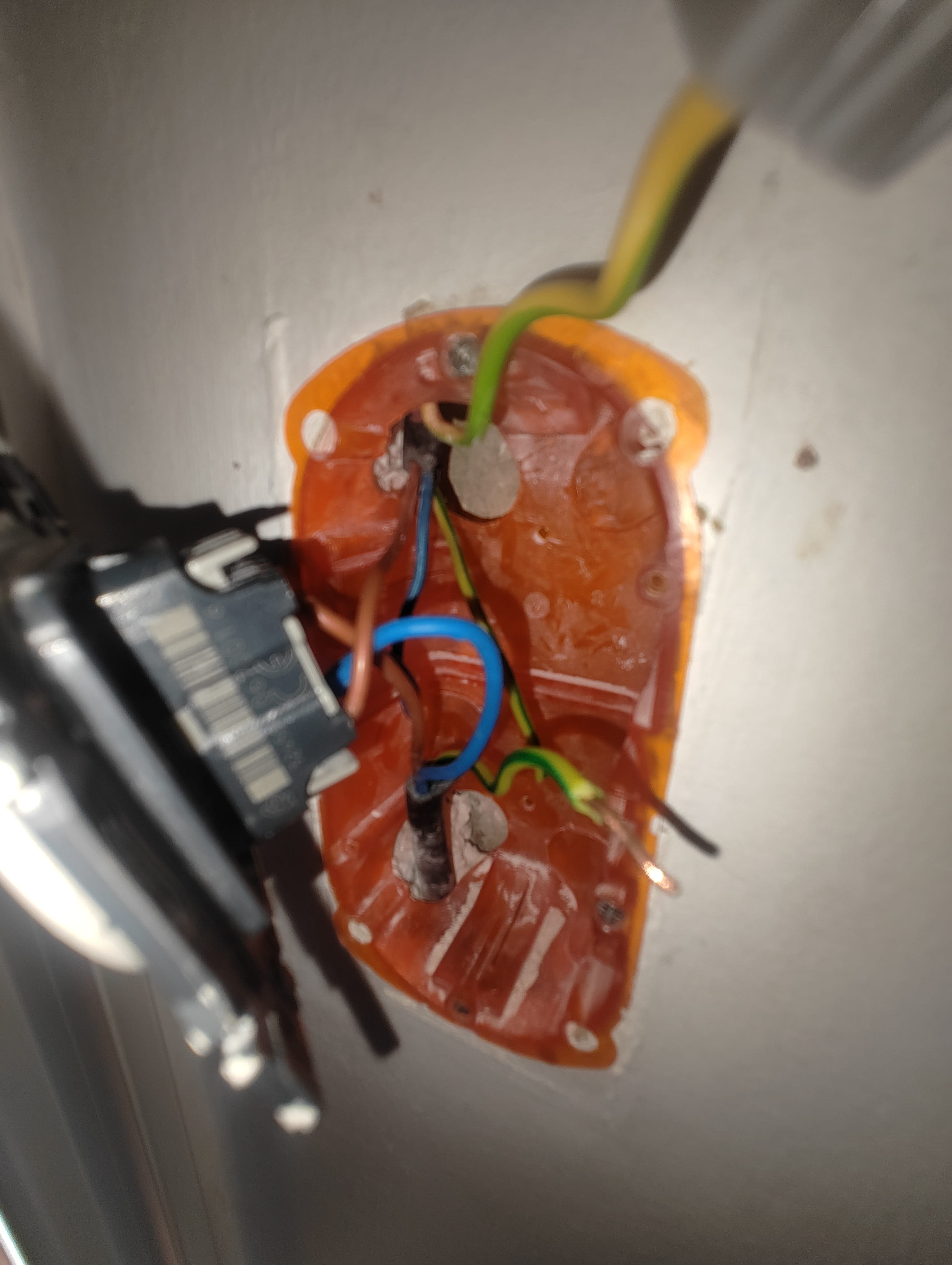 Il reste une terre à côté de la gaine du haut qui vient du store et qui auparavant semblait branchée à une sorte de connecteur avec la terre de la prise, puisque l'autre terre de l'ampoule n'est branchée ni en entrée ni en sortie.