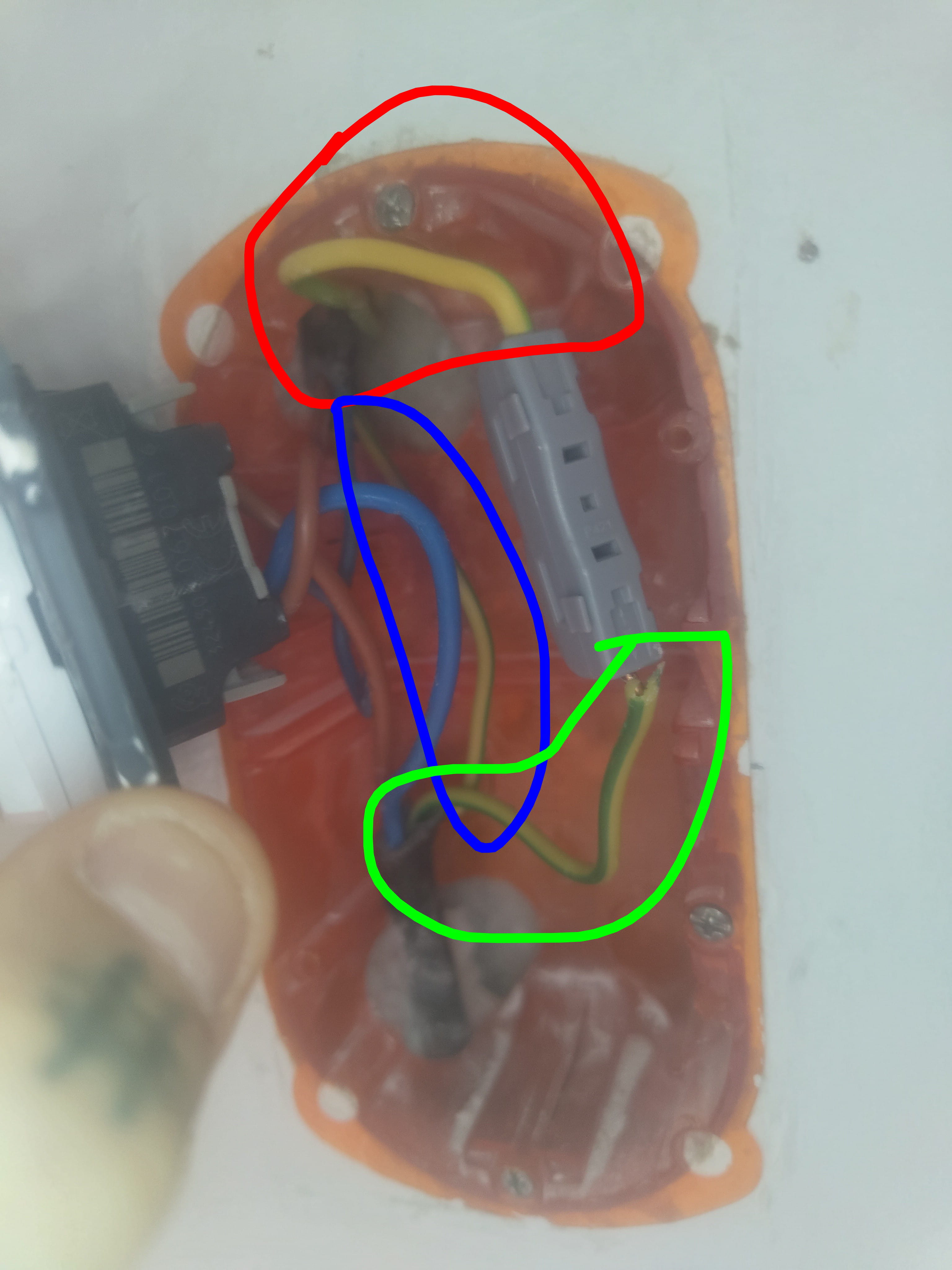 Pareil. Neutre, phase et terre appartiennent à une prise secteur. Tout est branché en bas à la prise avec 3 autres fils. Prise secteur 6 fils. Et la terre de la prise secteur je ne sais pas où la brancher.