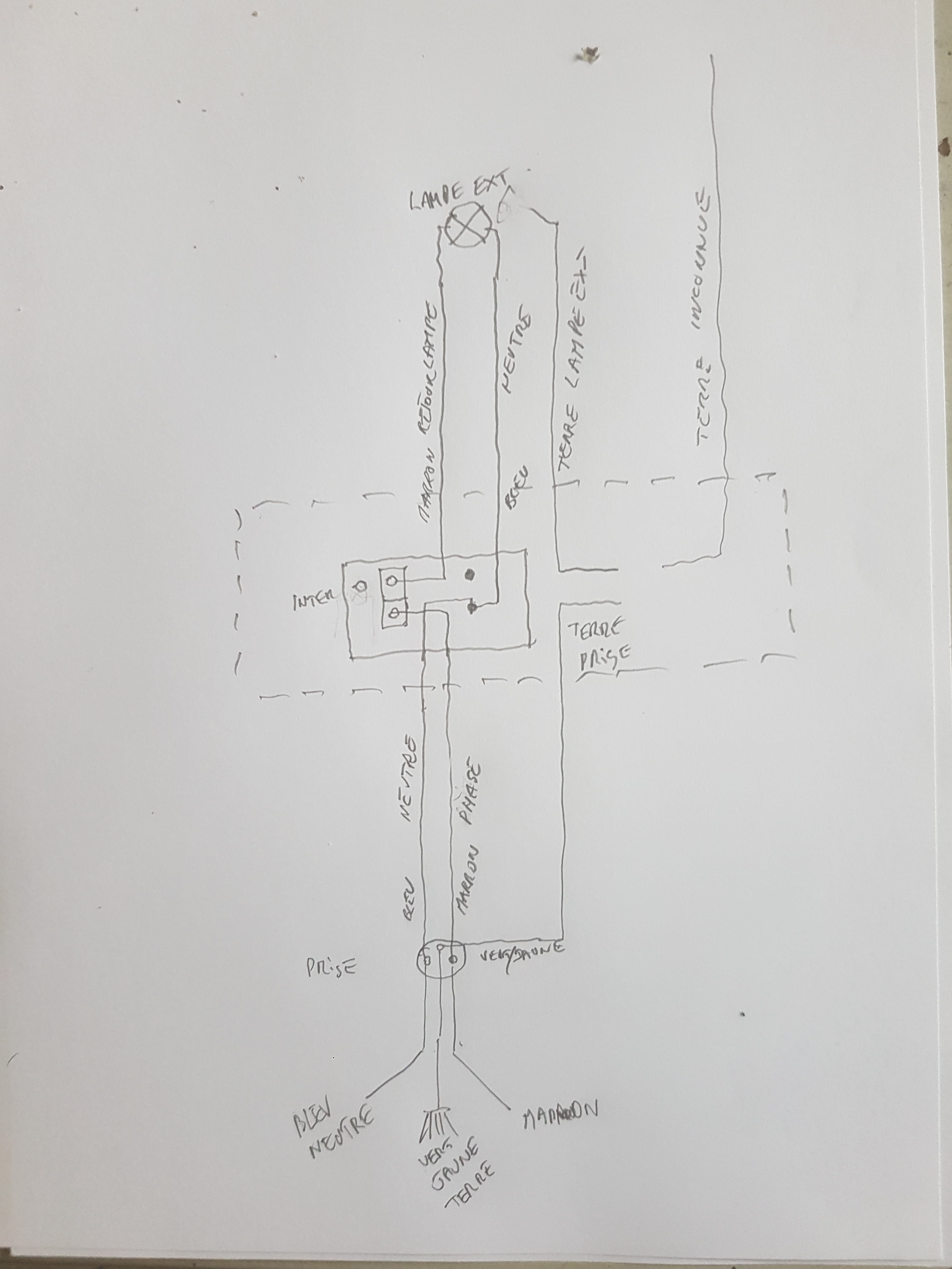 Ce soir je vous fais un plan comme doit être branchées un prise, un inter, .et comment doit être branchée votre installation. En aucun cas on ne branche une terre sur un interrupteur
