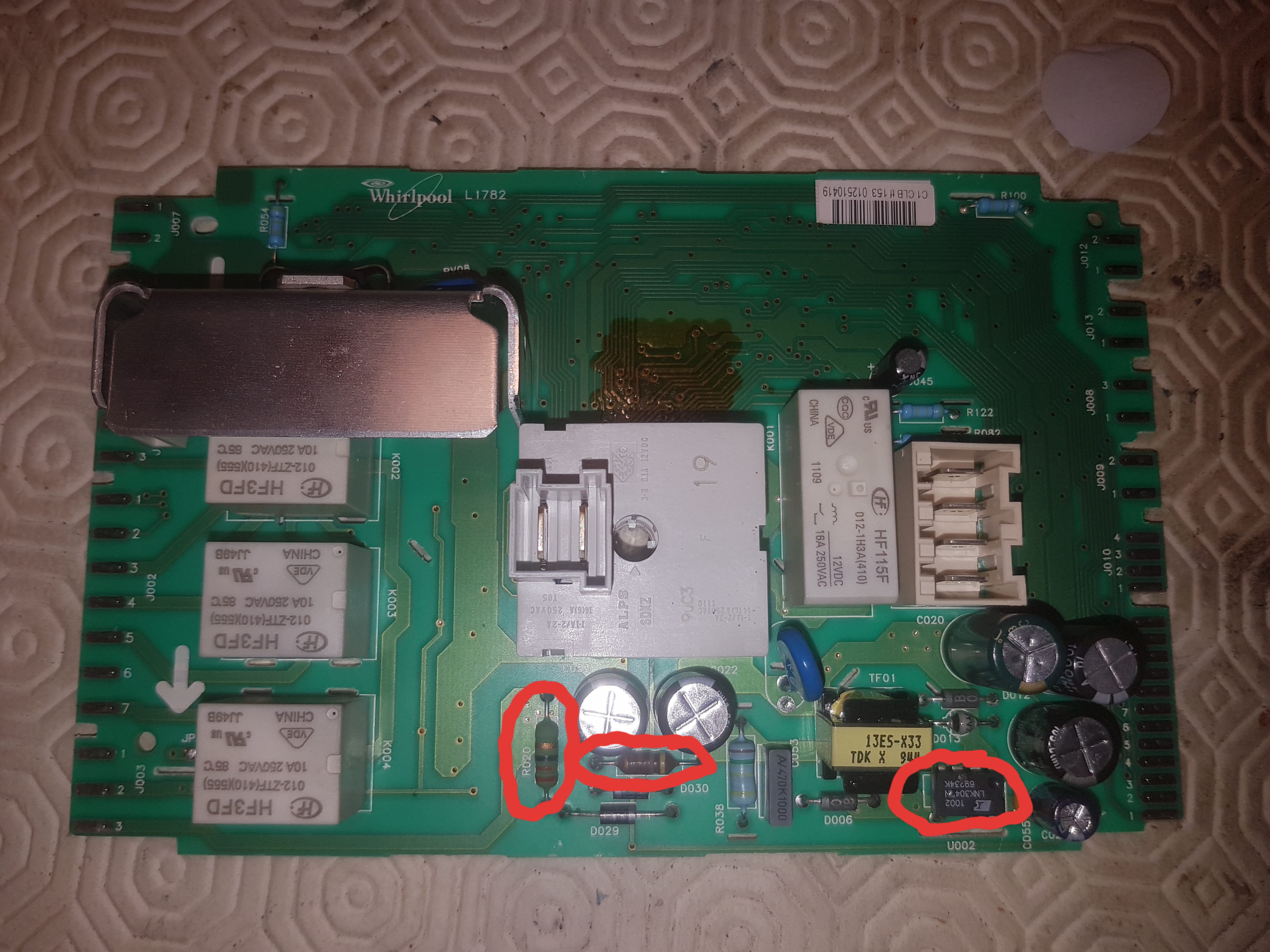 Donc ce lave linge a été abandonné car le module de gestion (carte électronique) a son alimentation interne qui a claqué sans doute le régulateur et autre composant sur la carte suite a un pic de tension extérieur a la machine